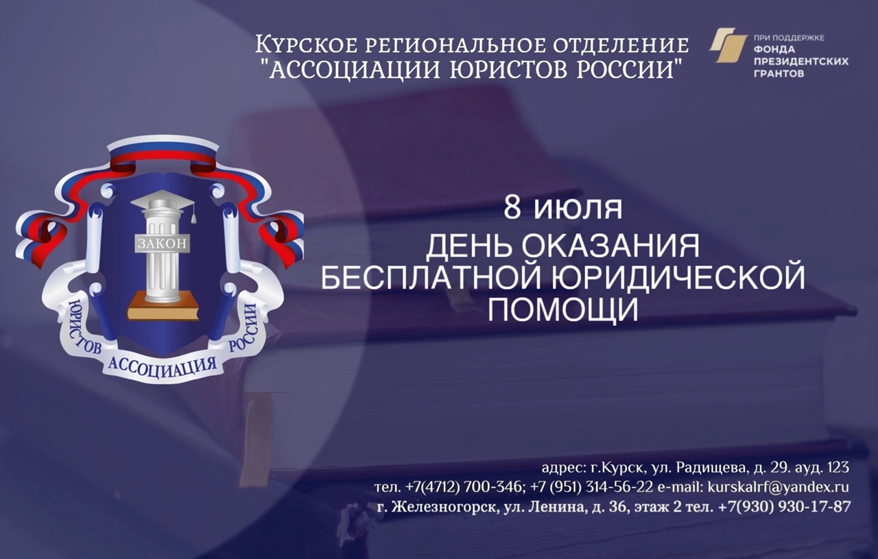 8 июля 2025 года Курское региональное отделение Ассоциации юристов России в рамках Всероссийской недели правовой помощи по вопросам защиты интересов семьи проводит День бесплатной юридической помощи, посвященный Дню любви, семьи и верности!